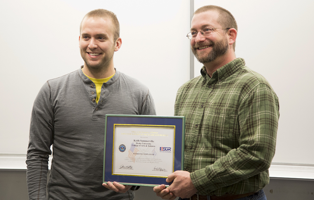 Keith Summerville, associate dean of the College of Arts and Sciences and associate professor of environmental science and policy, was honored by the Iowa Committee for Employer Support of the Guard and Reserve (ESGR) with a Patriot Award. The award recognizes supervisors who provide extraordinary support to employees who serve in the Iowa National Guard and Reserve.