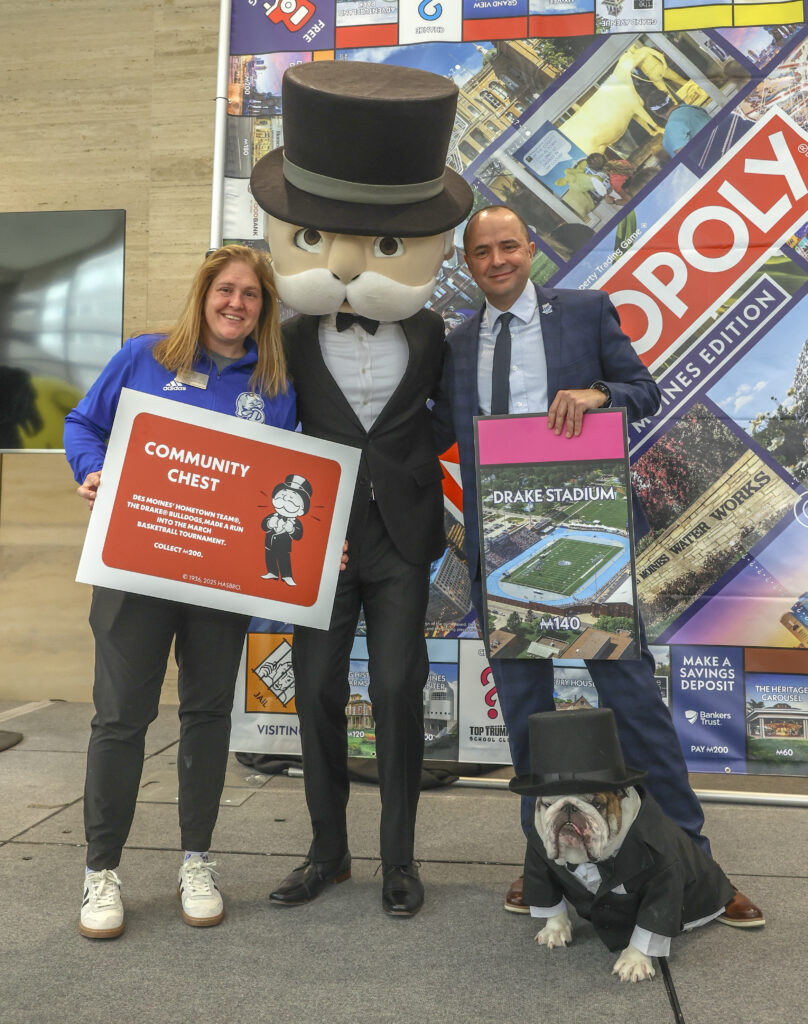 Drake University is celebrating its role as a key fixture in the newly released MONOPOLY: Des Moines Edition, unveiled today by Hasbro and Top Trumps USA. The game’s design spotlights Drake’s deep connection to the city, featuring the University’s beloved live mascot, Griff II, on both the game box cover and the center of the board.
