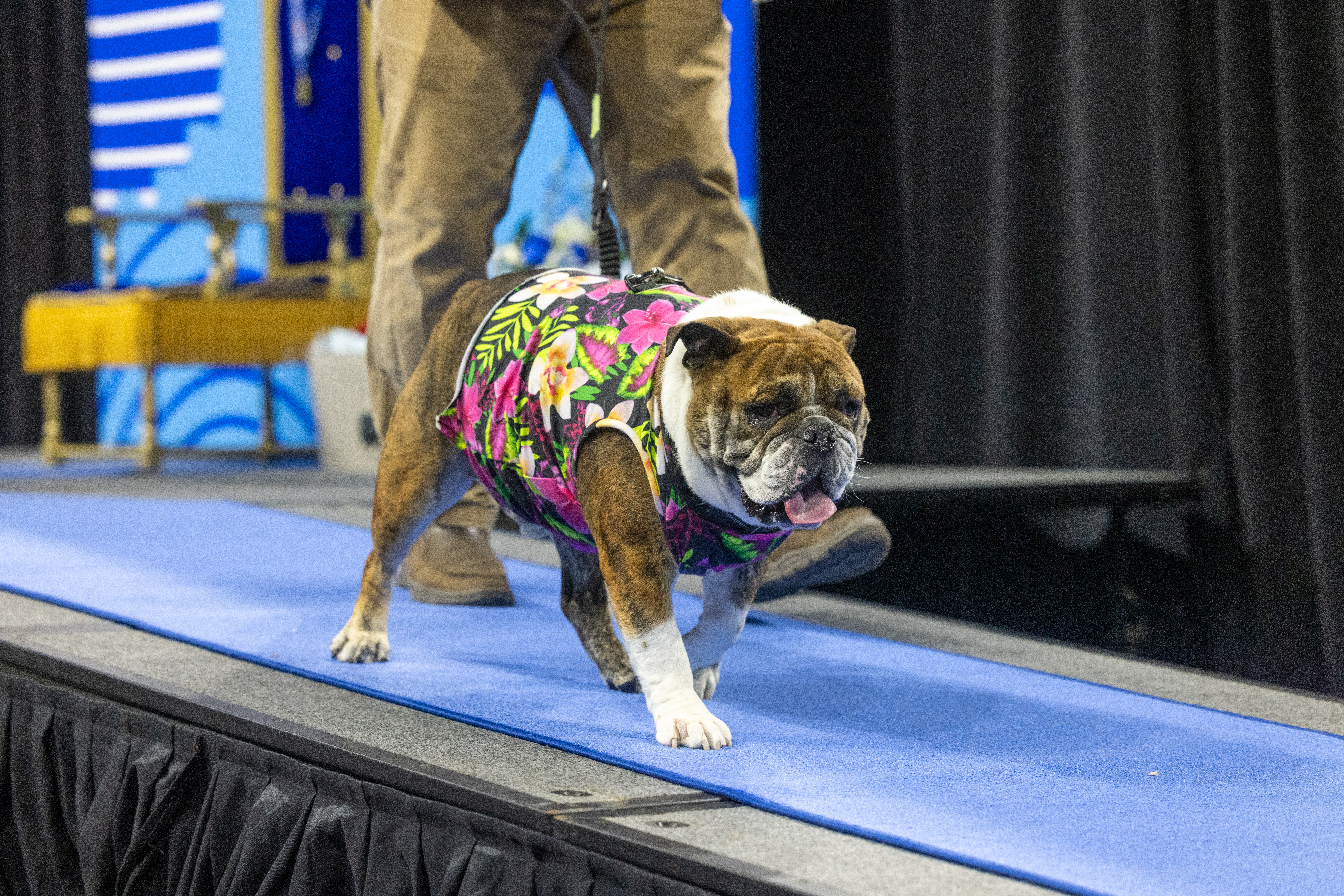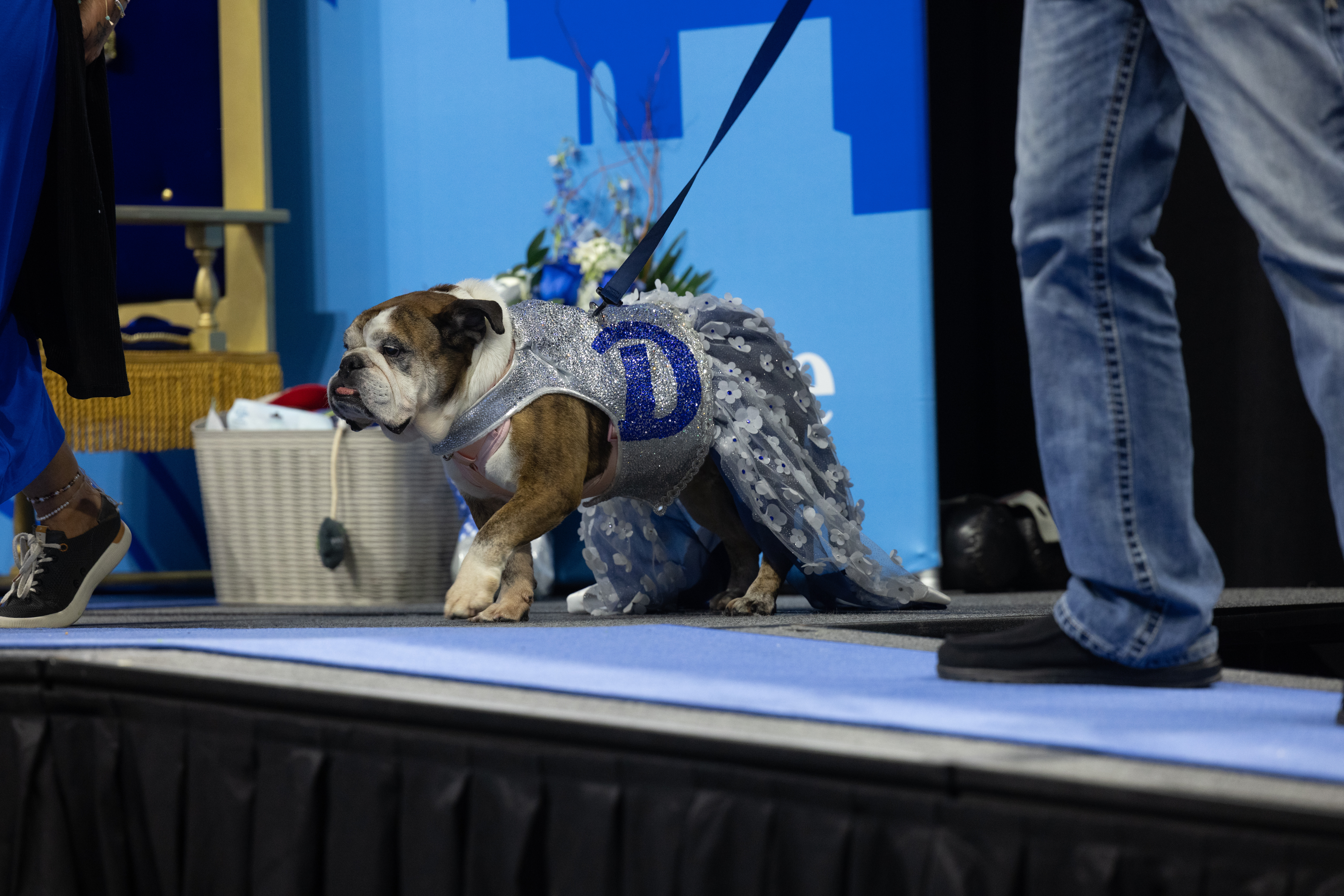 Flora, hailing from Iowa Falls, Iowa, stole the show during her strut down the “pup-way.” Accompanied by owners Nicole Gleason and Augie Wachter, the charismatic bulldog charmed the judges in her blue dress embellished with a glittery Drake “D” and white flowers. A puppy-mill survivor, Flora is happiest when soaking up attention from her loving humans.